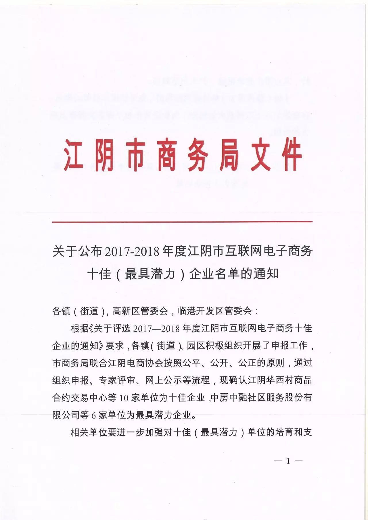 根据《关于评选2017—2018年度江阴市互联网电子商务十佳企业的通知》要求,各镇(街道)、园区积极组织开展了申报工作,市商务局联合江阴电商协会按照公平、公开、公正的原则,通过组织申报、专家评审、网上公示等流程,现确认江阴华西村商品合约交易中心等10家单位为十佳企业,中房中融社区服务股份有限公司等6家单位为最具潜力企业。
