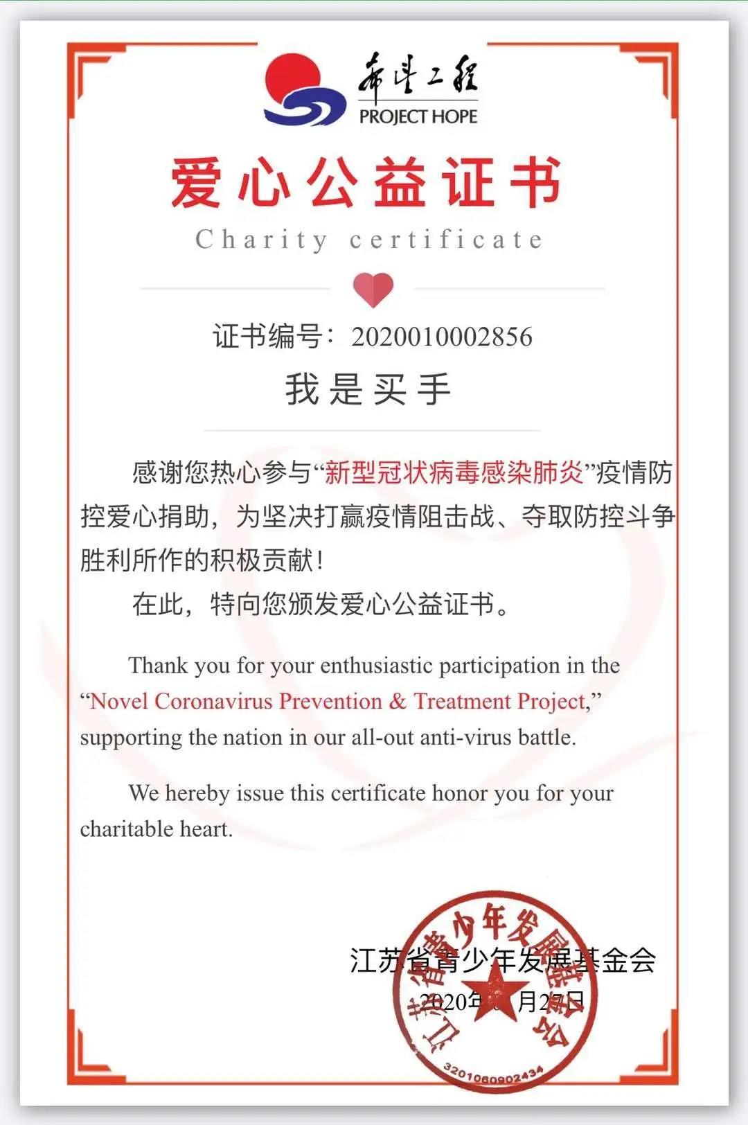 市政协委员、江阴市传澄电子商务有限公司董事长、我是买手平台创始人朱澄联合公司代理捐赠防疫物资价值50万元,公司通过青少年发展基金会捐助10000元,通过江阴市慈善总会捐助15000元。