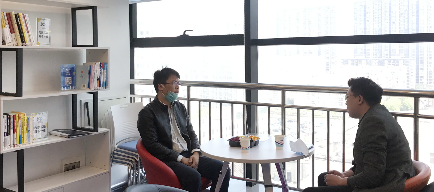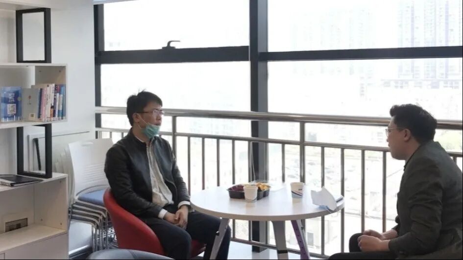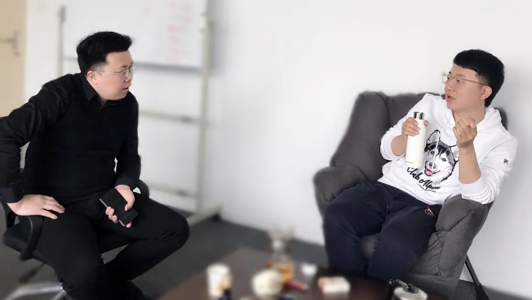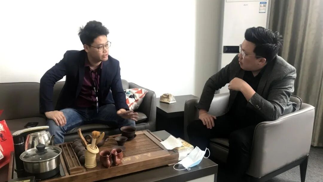 图4 江苏优可齐科技有限公司总经理堵晓伟,与童亮一秘书长交流人才、项目运营模式。
