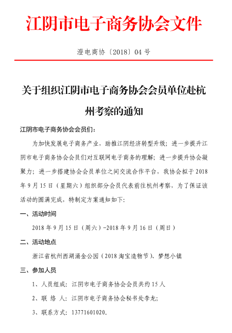 组织江阴市电子商务协会会员单位赴杭州考察的通知